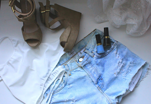 Summer has really been starting to kick in these past couple of days. I feel like I've been walking around in a gigantic oven that preheats in the mornings, and by noon is ready to start baking me alive. So It's no wonder that I had the sudden urge to take a pair of scissors to my newly thrift-ed vintage high rise denim jeans. Now I've been working on these shorts for the past couple of days. It turned out to be much more of a thought out process then I had originally intended. I figured I'd just hack off the legs to my hearts desired length and run an emery board a couple times over until I had a few cool looking frays. Then just like that a million little ideas popped into my head. I pulled out the bleach and soaked the Calvins in it with just a bit of water, and bit by bit the bleach ate away at the medium washed denim and created this real pale blue tone. I fell in love. Now with the GAP denim I tried my best at creating a more subtle design, but of course I had to have fun with it. I completely frayed the front of the shorts. I wanted a grungy but still neat look. Now I had to completely dishevel two emery boards to create these beauties but it was worth it. I put together a few accessories as a preview of what I plan to pair these babies with.